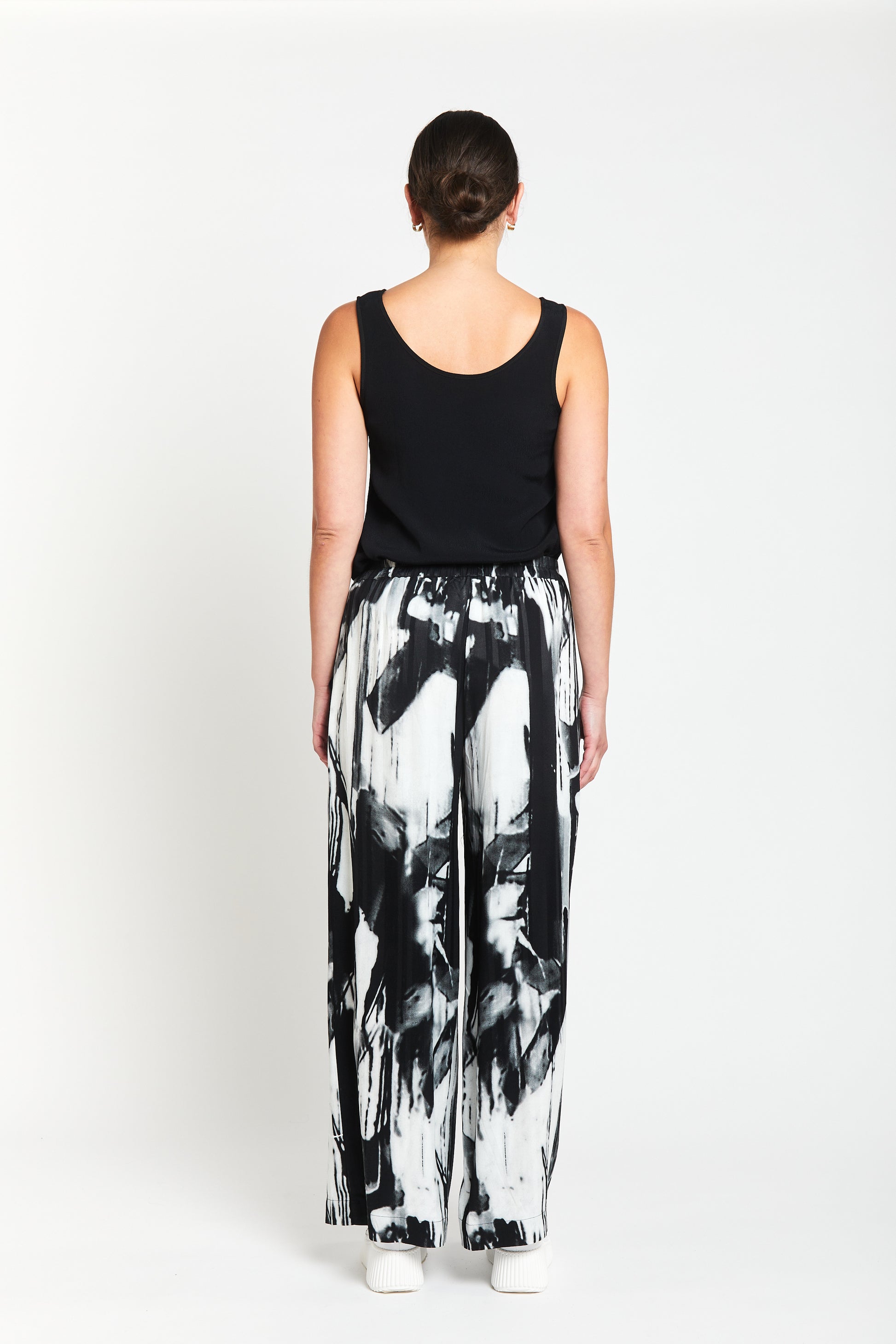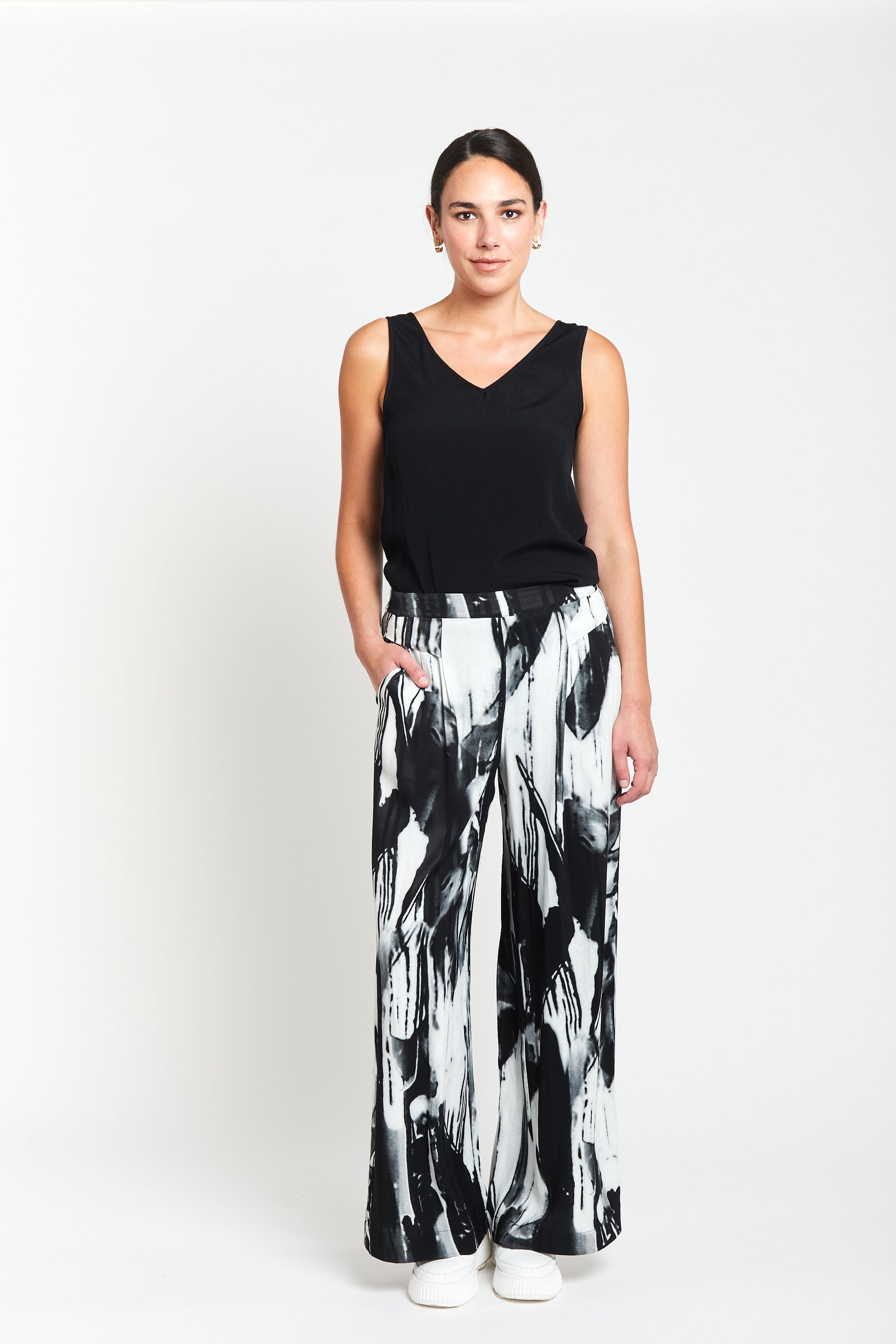 Skillfully rendered in a soft, fluid sateen viscose, the striking black and white monochrome brushstroke print captures the essence of creative printwork.