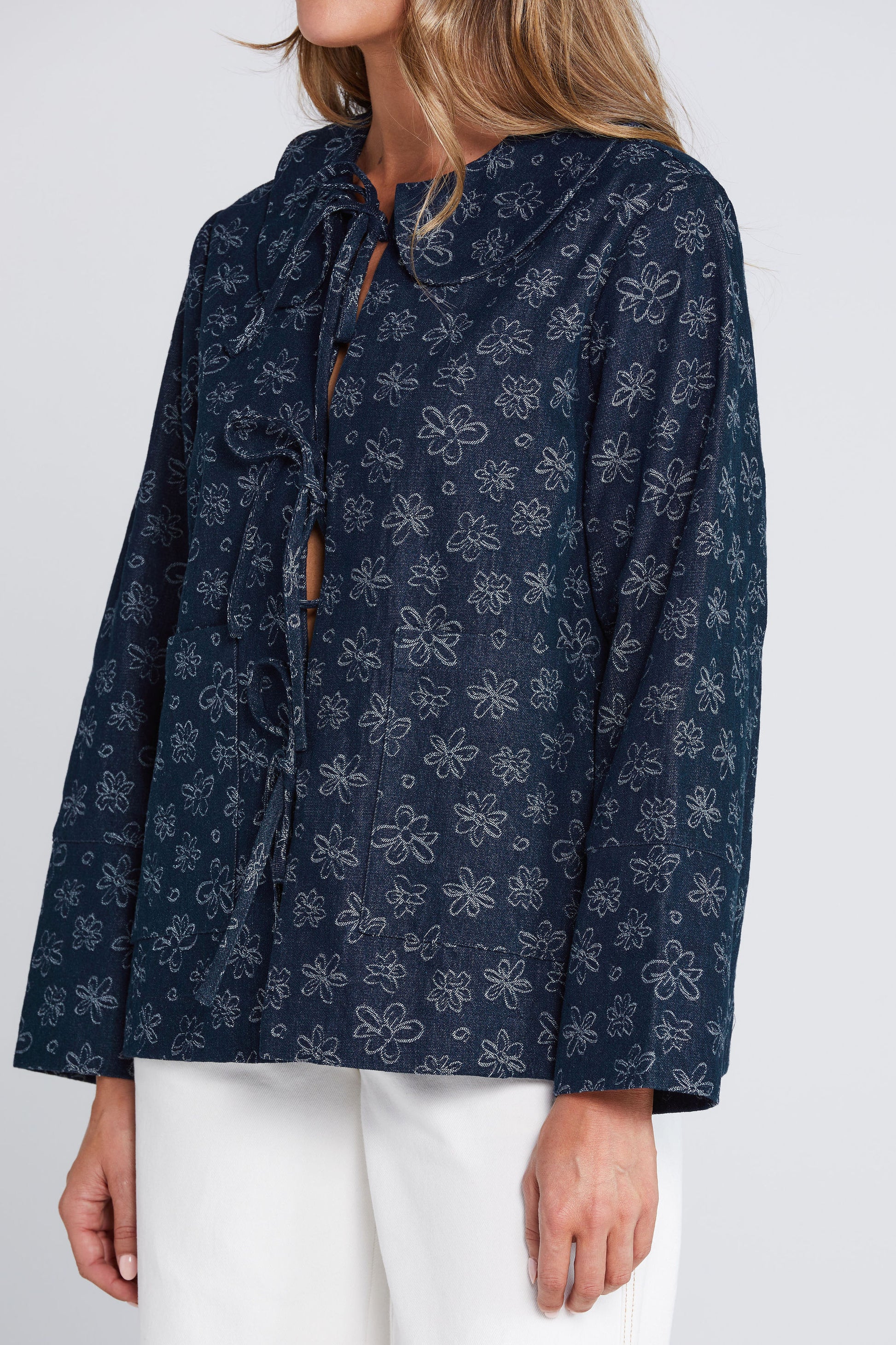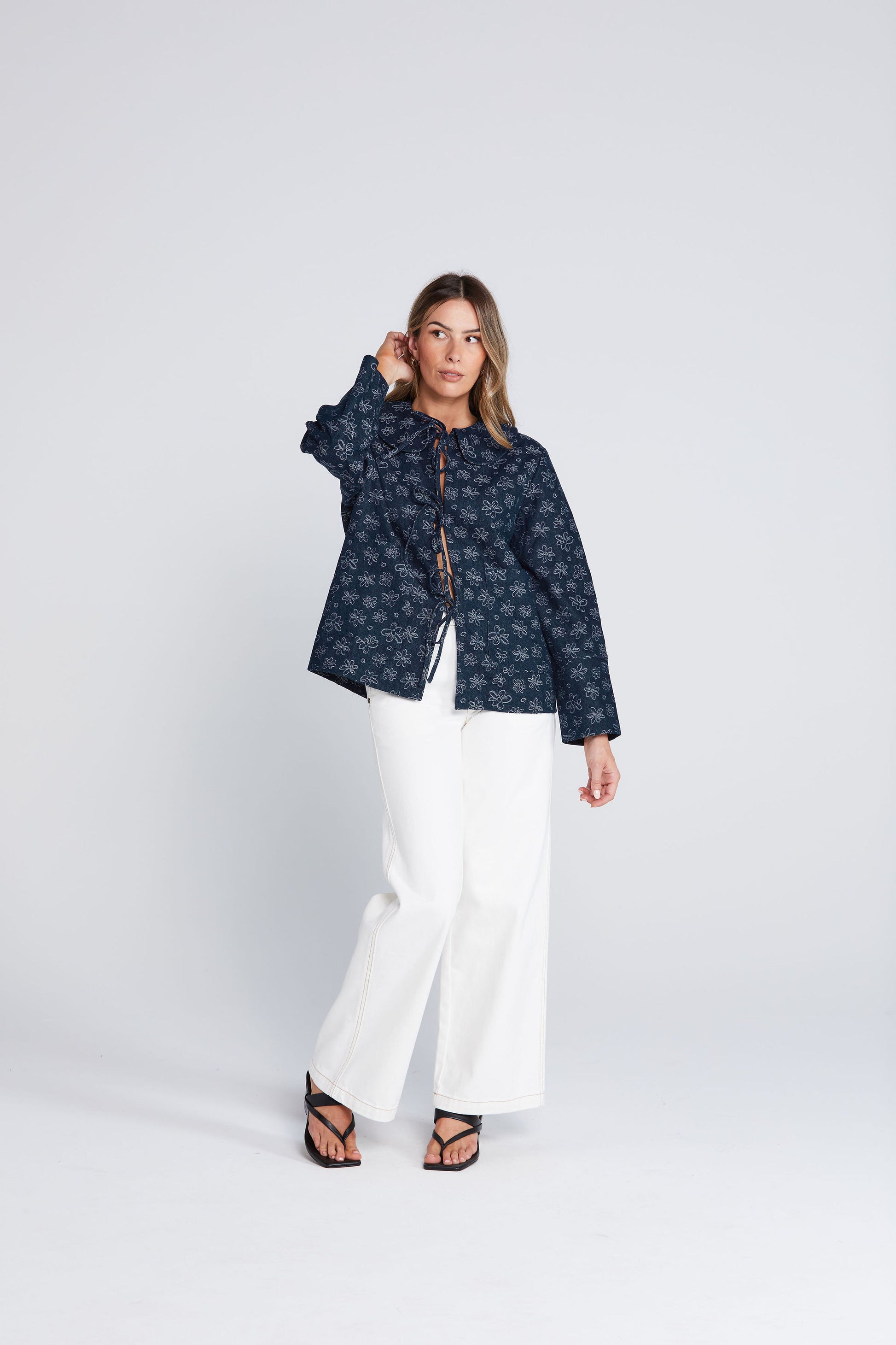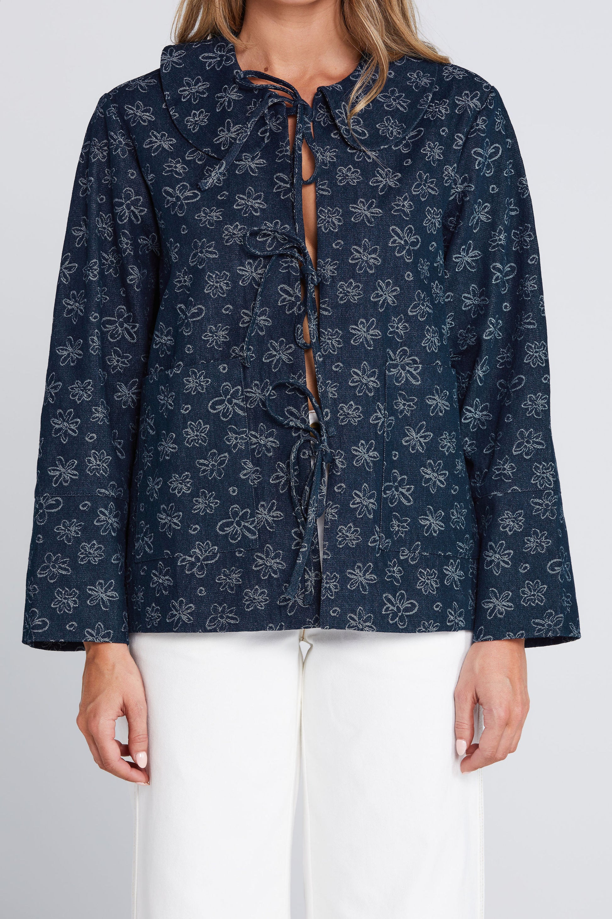 Crafted from a striking denim floral fabric, this piece features a curved collar and playful tie fronts that add a unique twist to any look. Whether you're starting a new journey or simply embracing each day with intention, the Commence Jacket is here to set the tone.