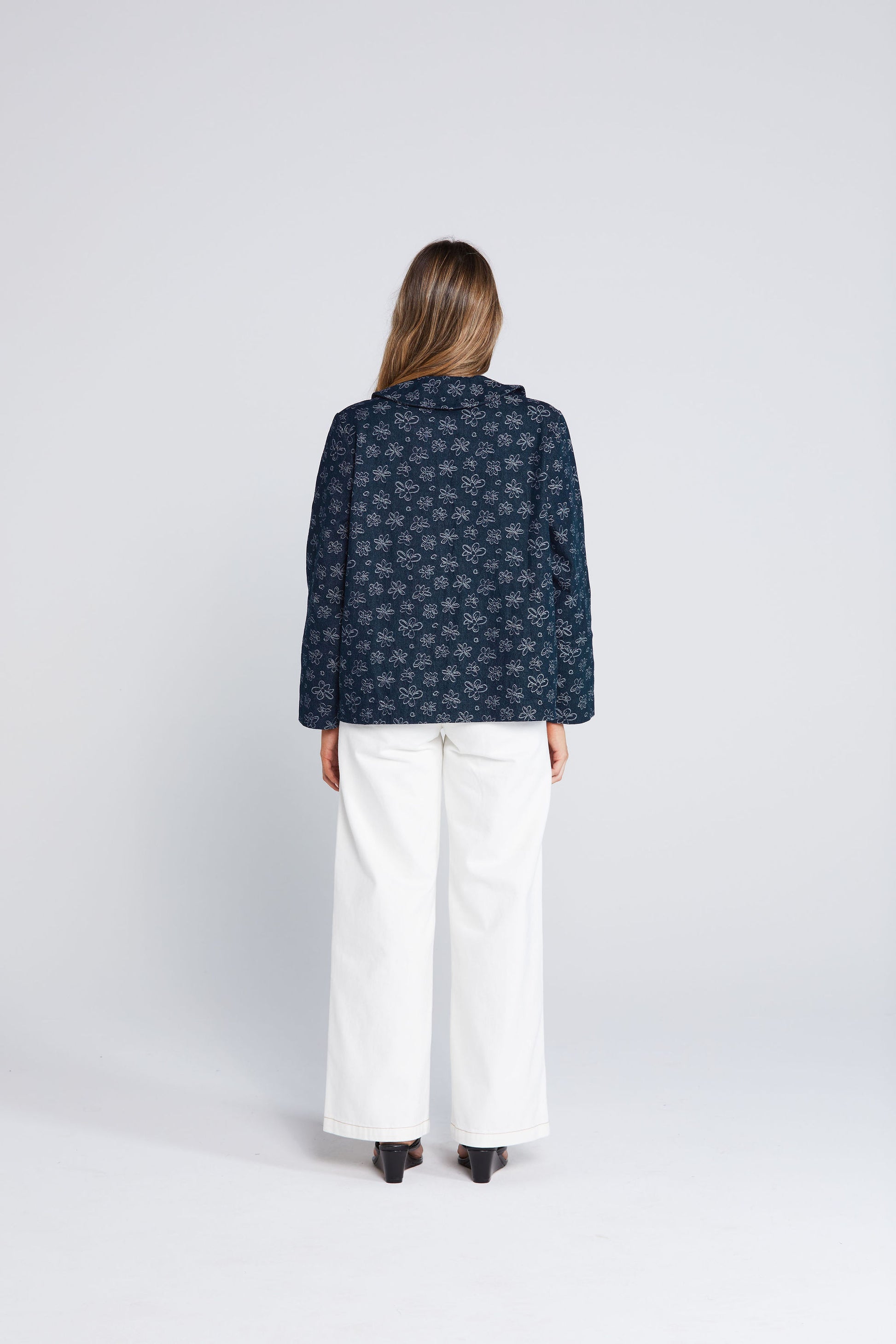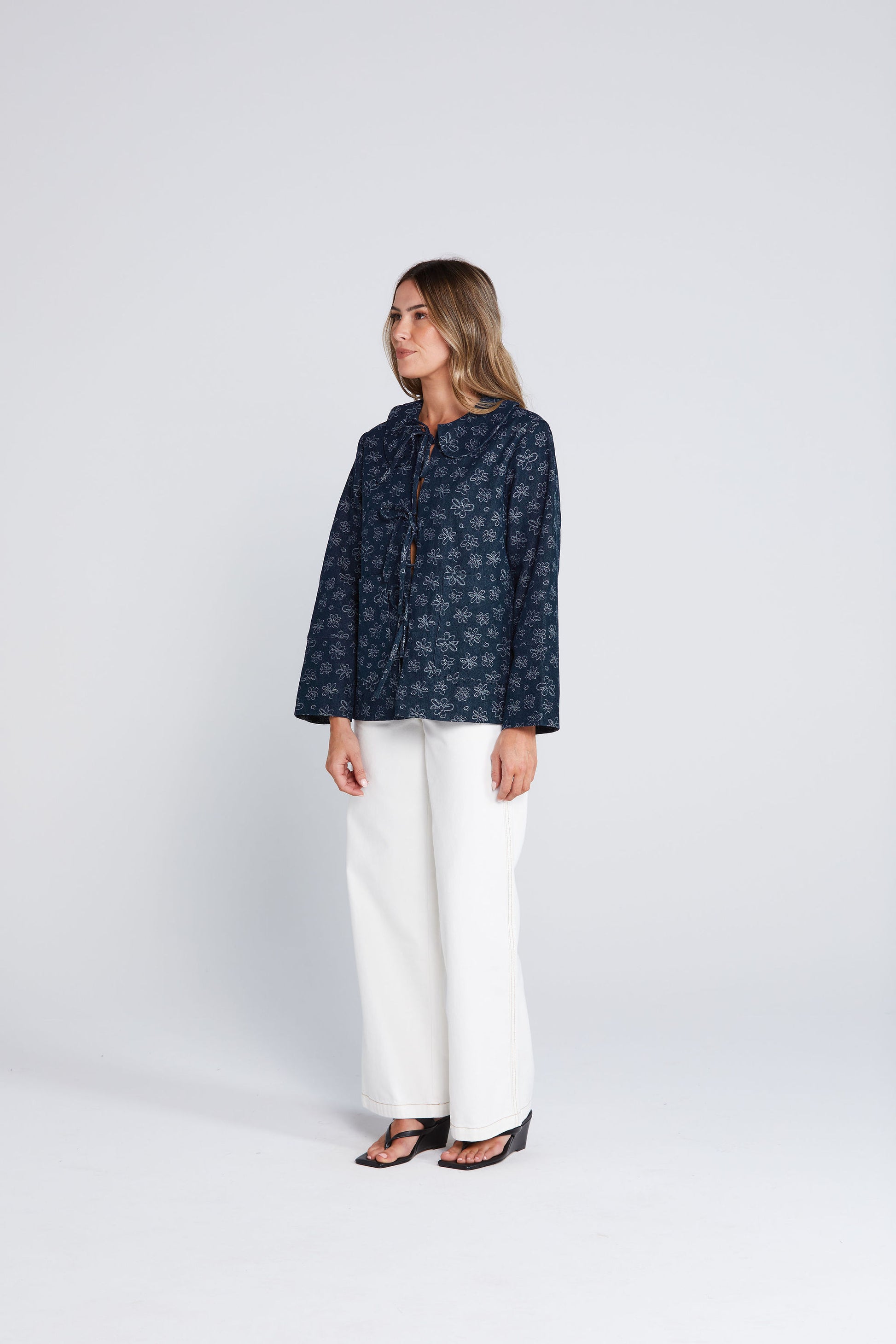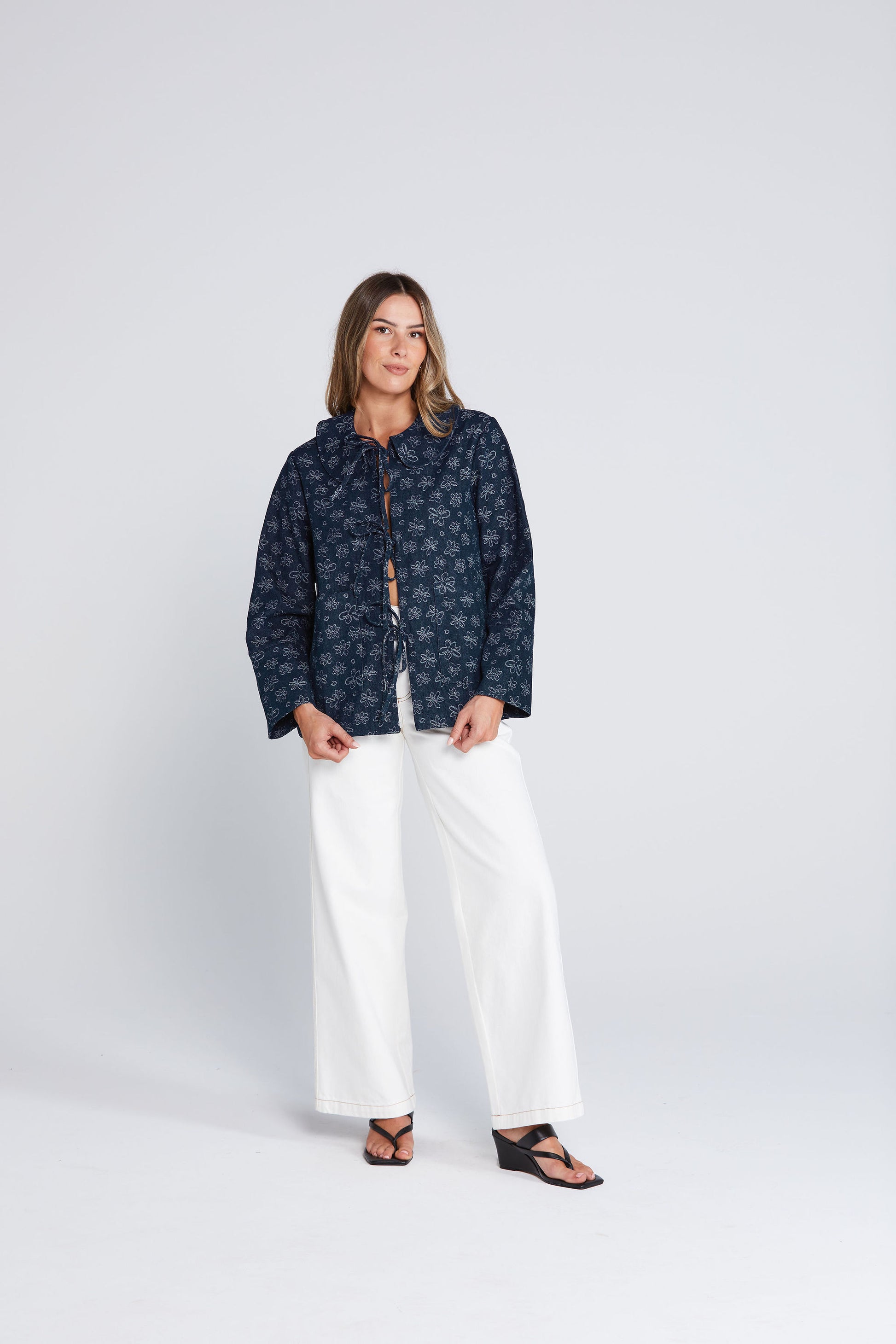 Crafted from a striking denim floral fabric, this piece features a curved collar and playful tie fronts that add a unique twist to any look. Whether you're starting a new journey or simply embracing each day with intention, the Commence Jacket is here to set the tone.