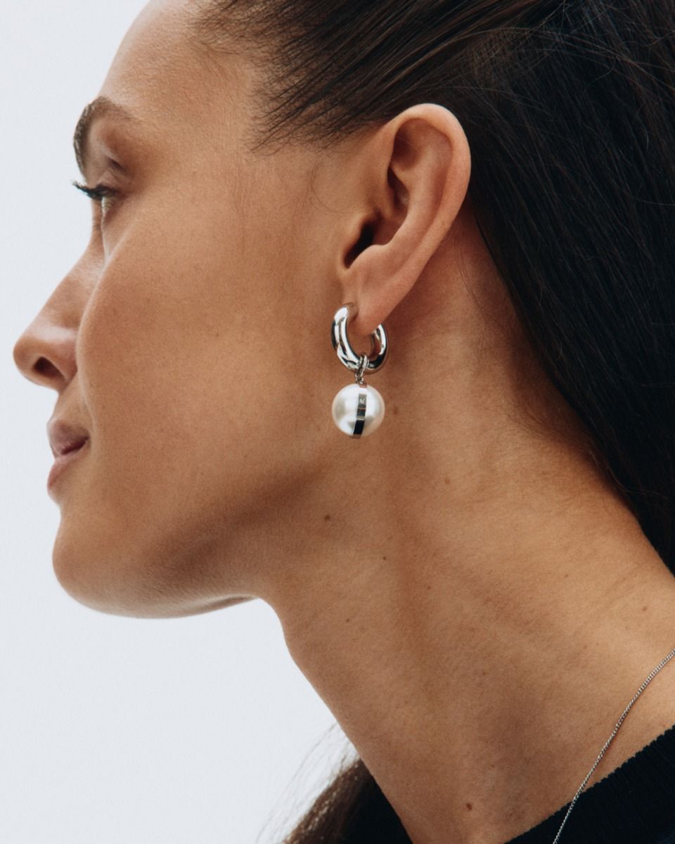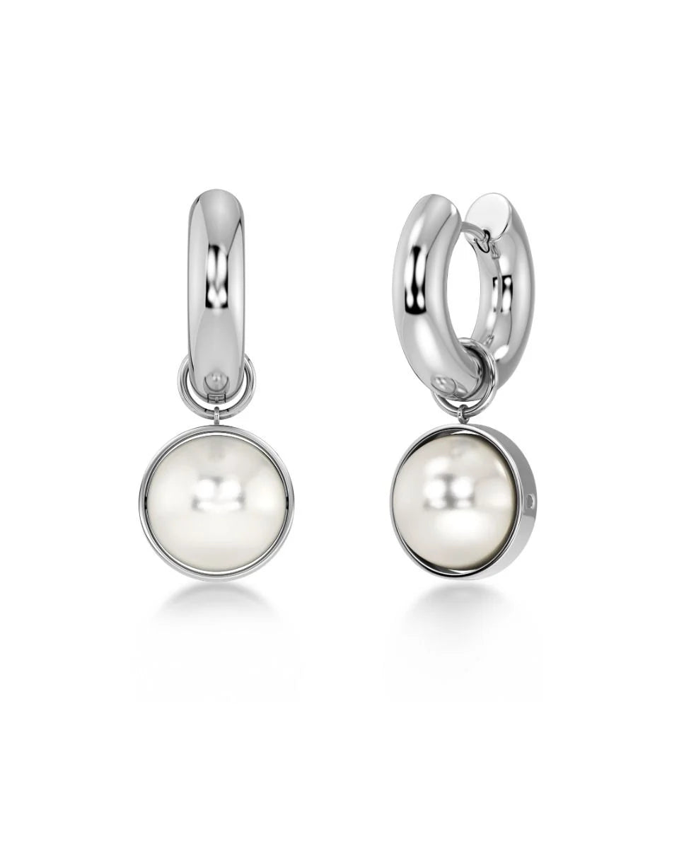 Timeless Gabrielle combines chains and beads for a bright modern look. In the larger hoops, the soft mother-of-pearl bead charm hangs beautifully from a neat rail and is removable to create two earrings in one. Seen here in shiny stainless steel. A stylish match with the fine bracelet, necklace or classic ring from the same line.