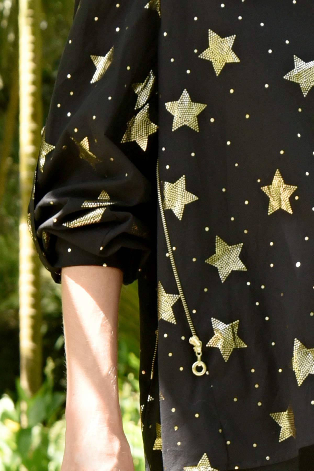 Lending an ethereal quality through the lightweight, foil printed ‘Starry Night’ cotton, the ‘Keeping Tabs on You’ shirt is a springtime savior. Featuring a simple button through front that is juxtaposed with edgy side zippers allowing for a more flared look, catering to your styling preferences. Not short of intricate details you’ll find star adorned buttons and a tab attachment for rolled sleeves.