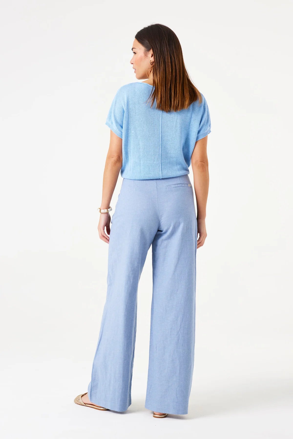 Sweater with prominent seam. A nice basic that should not be missing in your wardrobe! This sweater has short sleeves, a wide neck, and a relaxed fit. This item is made of 50% polyester, 30% viscose, and 20% linen.