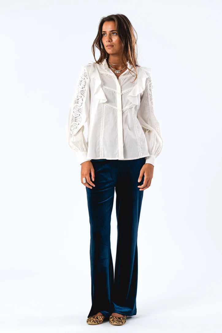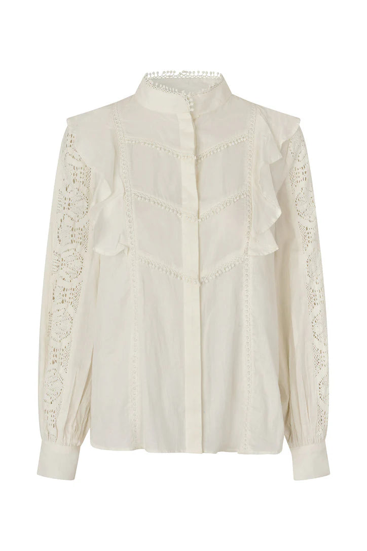 The elegant MajaLL shirt is a timeless classic that combines a romantic vintage look with modern details. The shirt is made from lightweight 100% cotton and features beautiful embroidered lace sleeves, adding a feminine and refined touch. Details like the ruffles on the shoulders and the delicate "mini-tassels" on the neckline and front emphasize the shirt's intricate design. With its slightly straight fit and the stunning lace cutouts on the sleeves, the shirt is perfect for both casual everyday outfits and more formal occasions. Style it with high-waisted trousers or a skirt to create a sophisticated yet relaxed look, making it a versatile addition to any wardrobe, no matter the season.