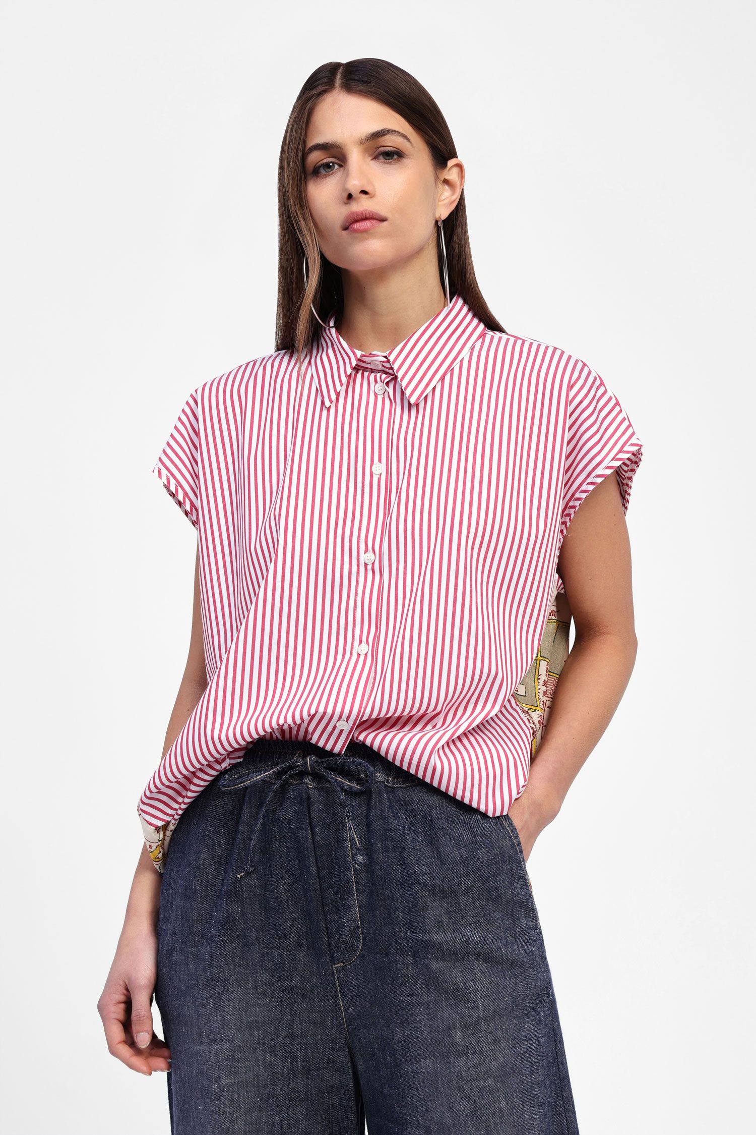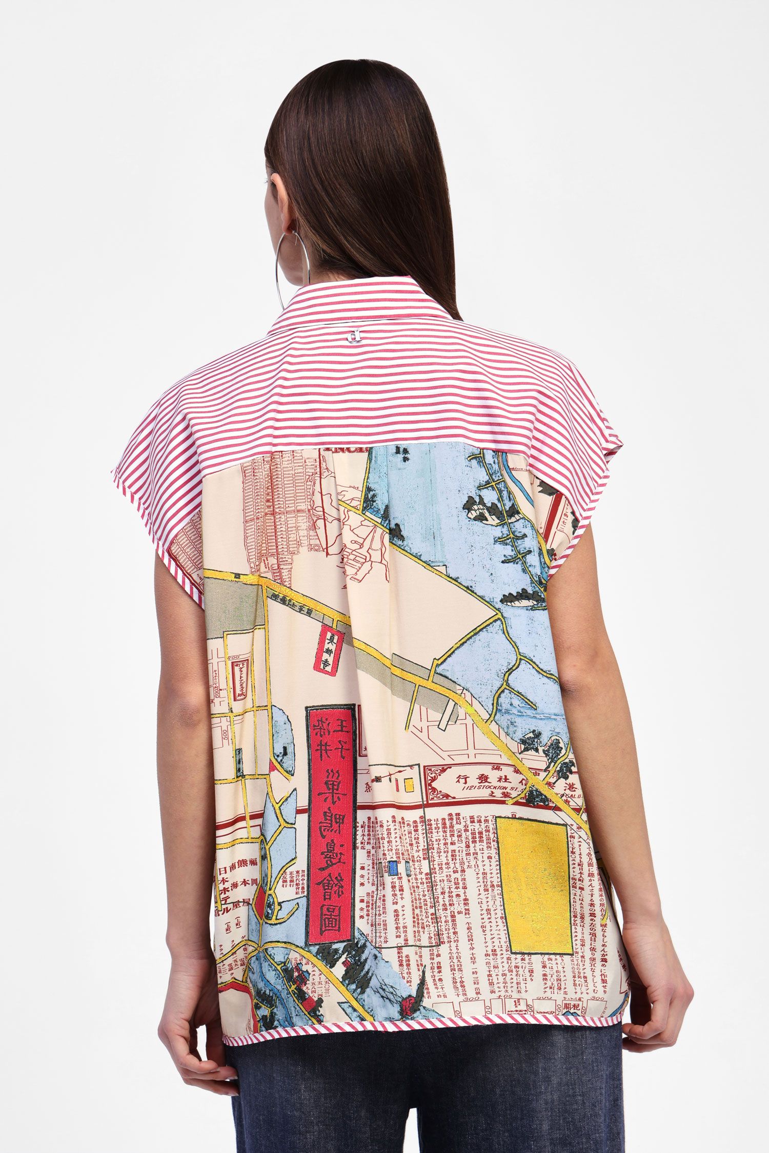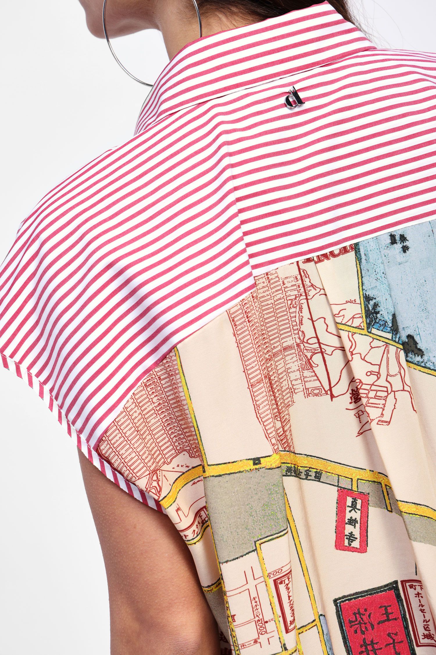 Be a part of two worlds with this funky double-sided shirt - all business in the front with a classic red and white stripe; and then contemporary trend-setter with this chic San Francisco Bay print on the back.