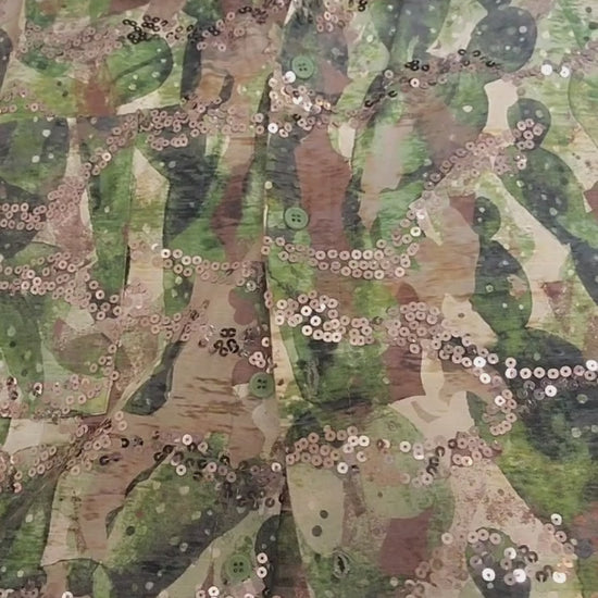 These trousers are your fun, feminine take on camo - jungle green leaf print with a neutral tan base and a smattering of stitched sequins. Go hunting for cocktails in these ankle-length cotton trousers. Pair with a plain tee and sneakers, or pair with the matching Sequin Jungle Cropped Shirt for a stunning evening co-ord look.