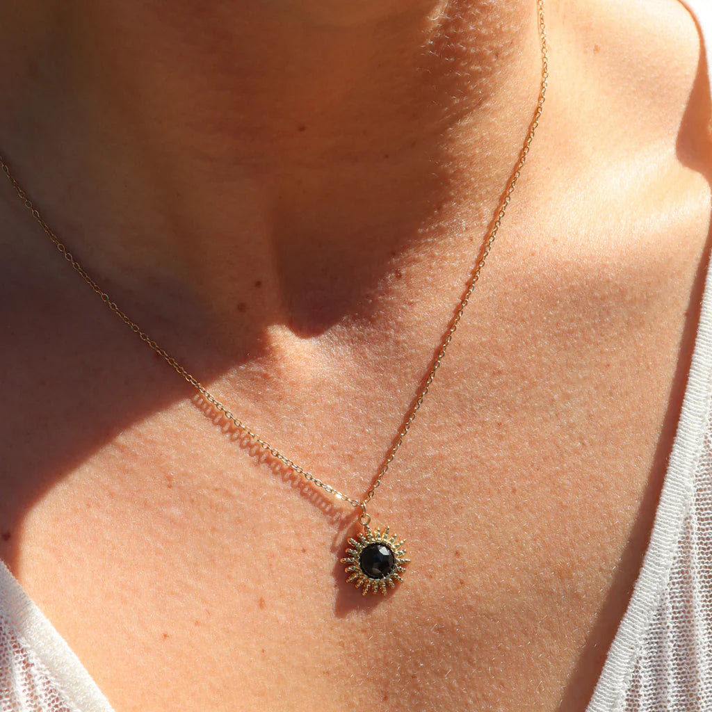 This sun-inspired necklace features a short, 45cm style with a stunning black onyx pendant. Crafted from stainless steel with 14kt yellow gold plating, it exudes sophistication and exclusivity. Wear it independently, or layer it with your FV yellow gold chains.