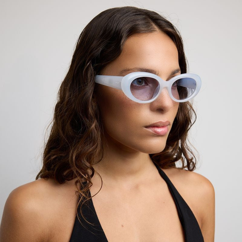 The Blair sunglasses by Szade boast a sleek oval silhouette that channels the effortlessly chic style of Blair Waldorf and Carrie Bradshaw. Crafted using recycled materials, this design is crafted with subtle cat-eye angles ensuring a flattering fit for various face shapes. The baby blue frame is paired with matching blue gradient lenses creating a stunning colour contrast while offering essential UV protection.