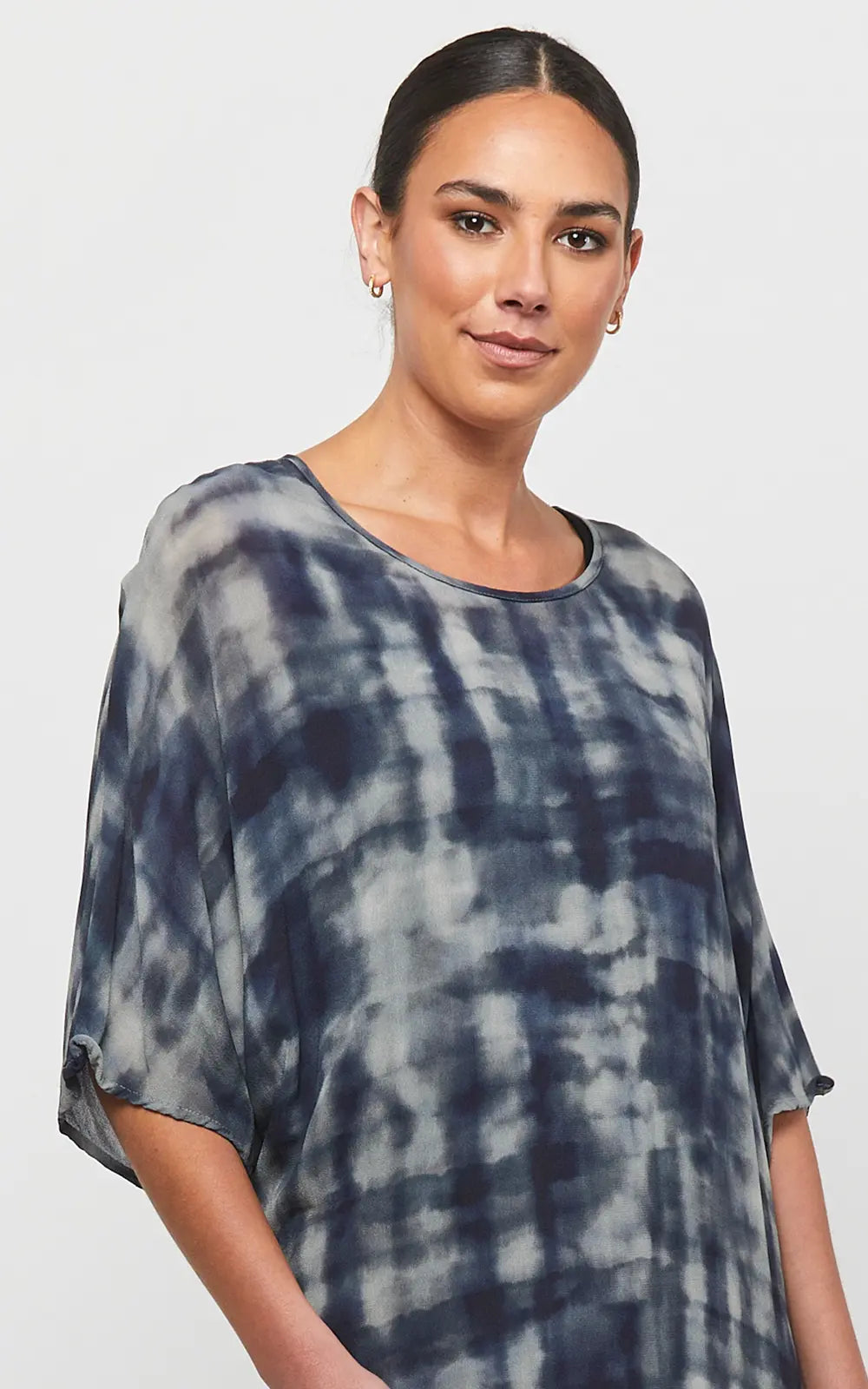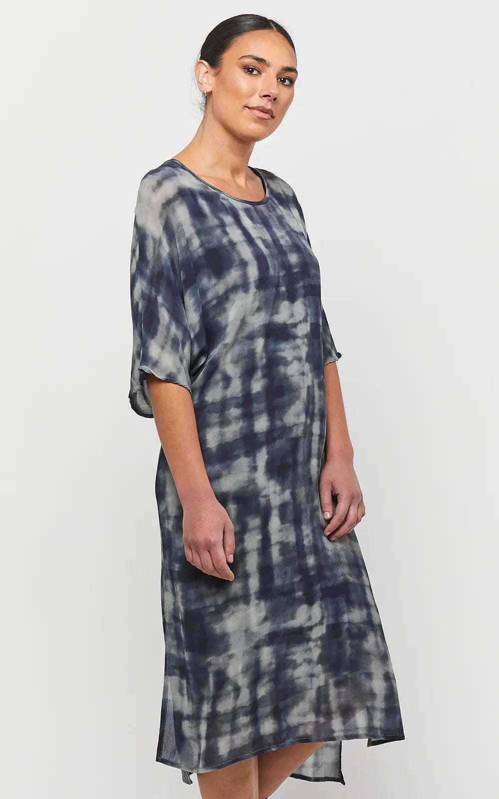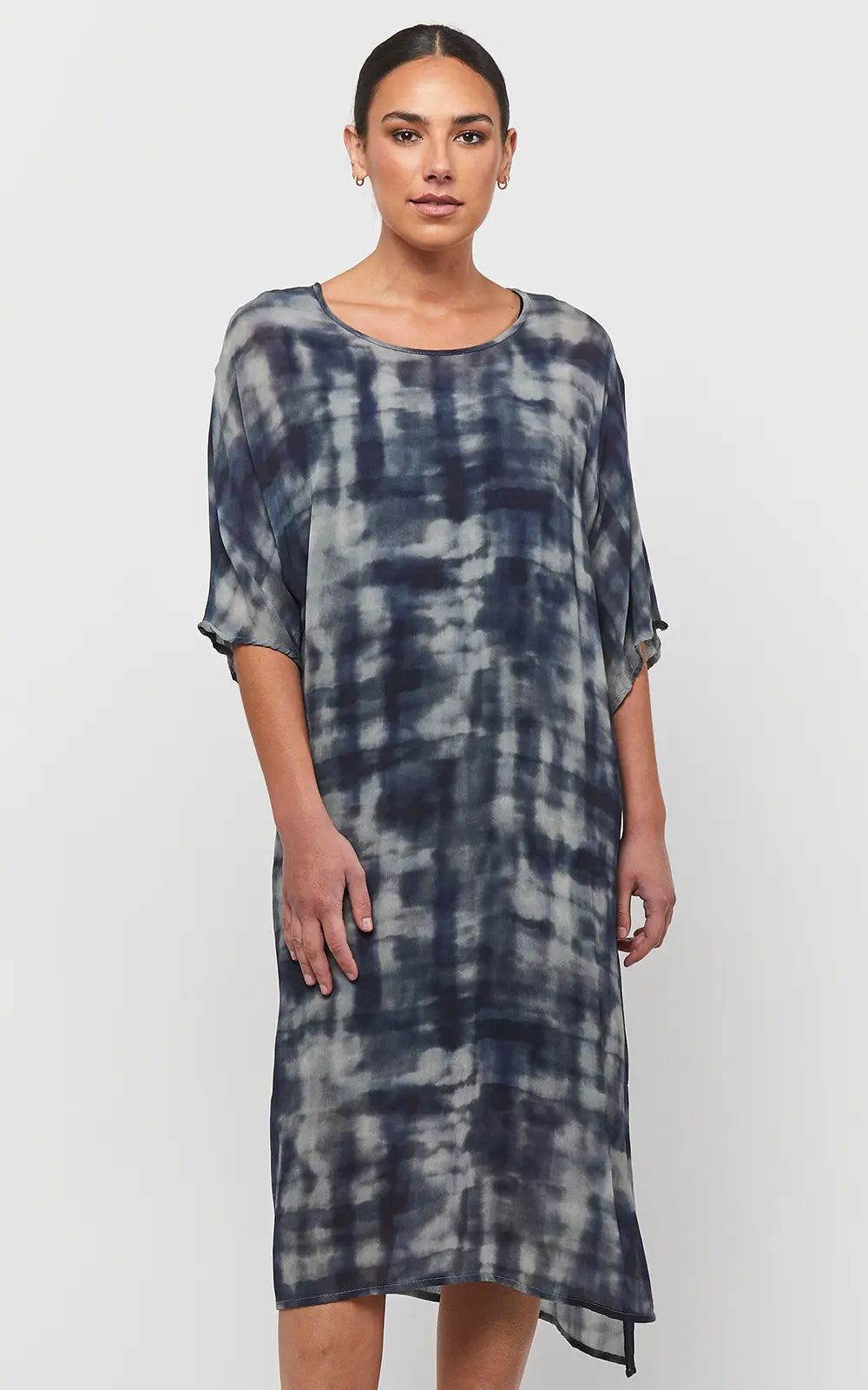 Experience the perfect blend of style and simplicity with the Thundercat Drape Dress, designed for easy dressing without compromising on elegance. This stunning dress features a scoop neck and relaxed sleeves that create a beautifully draped silhouette, enhancing your natural movement. Small split sides allow for effortless mobility. Crafted from exclusive Thundercat fabric adorned with an eye-catching abstract pattern, this piece showcases a captivating blend of pewter, black, and navy hues, adding depth and intrigue. Ideal for any occasion, this versatile dress transitions seamlessly from day to night, making it a must-have addition to your wardrobe for effortless sophistication.