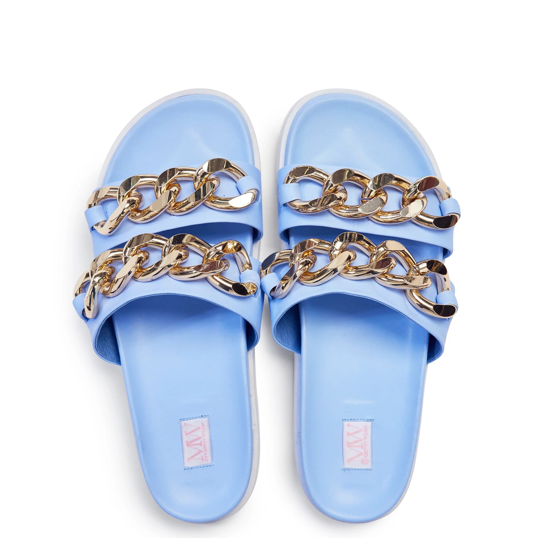 With a slight platform base, the Verona Slide evokes an elevated day time mood. Shaped with double strap and gold curb chain detailing. Assembled in the softest leather and set on a comfortable moulded insole.
